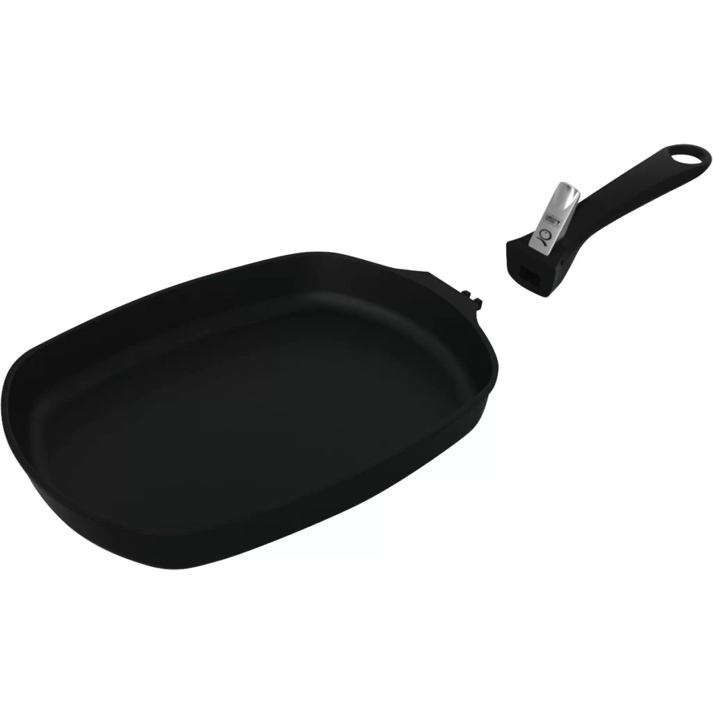 There is a reason I have two Weber’s Q Ware frying pans, they are a versatile and solid option for those who want an oven-safe frying pan that can easily be used on the BBQ or while camping. The non-stick surface makes it easy to cook your food without having to worry about it sticking. The detachable handle means you can pack it away easier to take it wherever you go. The handle is fairly easy to attach, but you would struggle using it directly on coals without burning your hand.